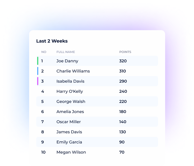 Leaderboards shine a light on your team’s greatest achievements, helping you celebrate top performers in every department. From individual leaderboards to company-wide recognition, this feature highlights the employees driving collaboration and achieving success. Whether you're reviewing sales team performance or tracking remote employees’ participation, leaderboards foster a sense of belonging and encourage effective employee contributions. Unlock visibility into how your team members make an impact with just a glance.